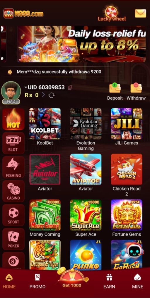 The N999 game is a mobile application where players can enjoy a variety of mini games. These games are especially designed as casino themes. Which includes slot machines, poker, Teen Patti, blackjack, and lucky spins.